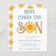 Invite family and friends to your baby boys' baby shower with this sun-themed budget baby shower invitation. It features the text "Here Comes The Son" in blue retro typography with a bright watercolor sun. The back is decorated with a sun pattern. Easily customisable. Original Watercolor © Michele Davies.