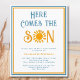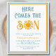 Invite family and friends to your sun-themed baby shower with this budget-friendly boy's baby shower invitation. It features the text "Here Comes The Son" in stylish retro typography with a yellow watercolor sun. Easily customisable. Original Watercolor © Michele Davies.