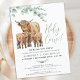 Celebrate the upcoming arrival of your little one with our charming and elegant baby shower invitations! Featuring an adorable highland cow and calf nestled among lush greenery and eucalyptus, these invitations are the perfect blend of boho chic and modern sophistication. The delicate watercolor illustrations of farm animals add a whimsical touch, while the elegant typography and minimalist design ensure your special event starts off on a stylish note.