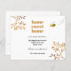 A chic white background decorated with faux gold botanical sprigs, foliage. With the thext: Home Sweet Home. Personalise and add your new address and name. Black and golden text.