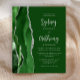 The left-hand edge of this elegant modern wedding invitation features a hunter green watercolor agate border trimmed with faux silver glitter. The customisable text combines light silver grey calligraphy script and sans serif font on a hunter green background. The reverse side features a matching green and silver agate design.