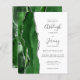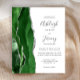 The left-hand edge of this elegant modern wedding invitation features a hunter green watercolor agate border trimmed with faux silver glitter. The customisable text combines handwriting, copperplate and italic fonts in charcoal grey on a white background. The reverse side features a matching green and silver agate design.