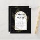 Introducing a softly formal black tie wedding item with black and gold colours adorned with delicate gold skeleton leaves overlaying the borders of an arched frame. This design is part of a coordinating collection and includes items such as RSVP cards, save the dates, invitations, welcome signs, stickers, napkins, programs, table number cards, favour bags, menus, and wine bottle labels, as well as a variety of card and paper types to fit any budget.