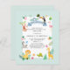 Cute jungle safari animals themed birthday invitation featuring tropical animals, an exotic bird, and other cute party elements. Send out the invites and celebrate the first birthday of the wild one with friends and family.
