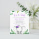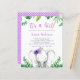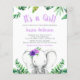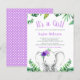 A cute purple jungle elephant budget girl baby shower invitation design. This cheap invite design features watercolor tropical leaves and a baby elephant illustration.