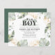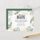 Wild, calm, and elegant boys safari animal baby shower invitation featuring a giraffe, gold effect and green leaves. Perfect for boys baby shower invitations