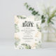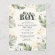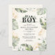 Wild, calm, and elegant boys safari animal baby shower invitation featuring a giraffe, gold effect and green leaves. Perfect for boys baby shower budget invitations