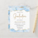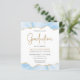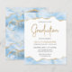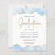 This trendy graduation party invitation features a top and bottom border of watercolor agate geode in shades of light blue with faux gold glitter highlights. The word "Graduation" appears in faux gold glitter in decorative modern handwriting font. Customize the invitation with the name of the graduate in gold colored text and the party details in charcoal gray on a white background. A matching light blue and gold agate image appears on the reverse side.