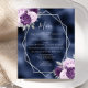 This elegant modern wedding menu features a silver geometric frame decorated with lilac, purple and silver floral bouquets on a navy blue faux foil background. The customisable text combines silver grey whimsical handwriting, copperplate and italic fonts.