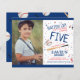 Celebrate your little rookie's birthday with this birthday invitation, featuring a personalised photo of your kid. This budget-friendly vibrant invitation card features adorable baseball decorations, blue and red colour scheme, confetti that energises the atmosphere and a megaphone that adds excitement. This appealing and engaging birthday invitation card is perfect for parents who want an affordable yet memorable celebration for their child's milestone. Get ready to batter up and create lasting memories with this birthday invitation.