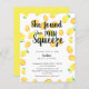 Budget Lemon bridal shower with text that says "She found her main squeeze" bridal shower invitation. WARNING: Please do not choose the Satin paper type for your Budget invites as it is very thin and paperly. Thank you.