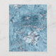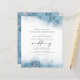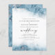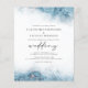 This elegant wedding invitation features a light blue watercolor border design in imitation of marble veined with faux silver foil, fading gradually into the white background. The word "wedding" appears in charcoal grey handwriting script, with the remaining text in serif capitals. The blue and silver marble pattern is repeated on the back of the card.
