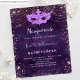For an elegant Masquerade, Quinceañera, 15th birthday. A purple background pattern. Decorated with rose gold faux glitter dust and a masquerade mask. Personalize and add a name, and party details. The name is written with a hand lettered style script