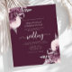 This elegant wedding invitation features mauve floral bouquets set off with silver faux foil greenery in two corners, on a deep mauve purple background. The customisable text combines silver grey serif, italic and handwriting fonts. The floral design is repeated on the reverse side.