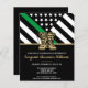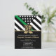 This design features a military flag with black and white stripes, and a thin green line stripe as well. The army boots and gold text sits above all of the party details for the retiring sergeant, captain, soldier, lieutenant or general's retirement party details.