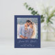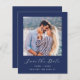 This simple, minimalist Save the Date card features a square photo above the words "Save the Date" in elegant white handwriting script, followed by the couple's names, wedding date and city in sans serif font on a navy blue background. Add a more detailed message with additional information on the reverse.