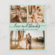 Budget, Modern, Elegant, Hand Lettered Wedding Mint Green (3) Three Photo Collage Thank You Cards. Stylish wedding thank you card template featuring three photo on the front and one photo on the back. With the text "Love and thanks" in a swirly hand lettered typography script font with swashes in black colour on pastel mint green colour background. Little heart shape between the names. Personalise the custom name and thank you message. If you prefer to handwrite your note, just delete the sample text to make more space. If You need help or matching item, please contact to designer!