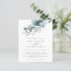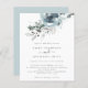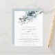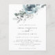 Modern Christmas Florals Wedding Invitation. A budget price SMALLER 4.5” x 5.6” alternative. Available in a SEMI-GLOSS 110 lb CARD STOCK which is the default option (thicker for invitations), OR a SATIN FINISH 80 lb THINNER PAPER STOCK (ideal for enclosures). Envelopes are an optional extra and are slightly larger than the card size. Christmassy teal and powder blue florals and foliage flow from the top and elegant text centred below. Easily personalise the text to your own details.
