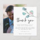 Modern Eucalyptus Photo Wedding Thank You. A budget price SMALLER 4.5” x 5.6” alternative. Available in a SEMI-GLOSS 110 lb CARD STOCK which is the default option (thicker for invitations), OR a SATIN FINISH 80 lb THINNER PAPER STOCK (ideal for enclosures). Envelopes are an optional extra and are slightly larger than the card size. Contemporary style with a single branch of artsy eucalyptus in soft teal and rose pink form the top right. Thank You is set in an informal handwriting style and is placed below the foliage along with your message and names which you can easily personalise. Easily swap in your favourite photo on the back as a memento for your guests. You can change text and background colours to any of your choice to match your wedding colour theme.