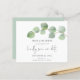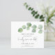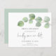 Modern Eucalyptus Script Save The Date. A budget price SMALLER 4.5” x 5.6” alternative. Available in a SEMI-GLOSS 110 lb CARD STOCK which is the default option (thicker for invitations), OR a SATIN FINISH 80 lb THINNER PAPER STOCK (ideal for enclosures). Envelopes are an optional extra and are slightly larger than the card size. A minimalist foliage design to invite your guests to save your date. Kindly Save Our Date is in a modern set script.The rest of the text you can easily personalise. Text and background colours can be changed if you wish via the customise further option.