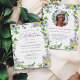 This is a bright and modern memorial invitation card to celebrate the life of your loved one. This a budget friendly invitation printed on a paper sheet. The design features a calligraphy font with lovely botanical ivy and fern greenery as well as florals including purple pansies and hyacinths, plus yellow daffodils. This invitation can easily be personalised with your own photo and text to create a special tribute for your loved one's funeral, memorial or celebration of life using the template provided.
