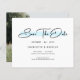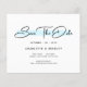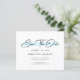 Budget Modern Minimalist Script Save The Date Invitation Card features "Save The Date" in an elegant black script over a modern blue accent on a white background with your Save The Date information below. Personalise by editing the text in the text boxes provided and adding your favourite photo to the reverse. Designed for you by ©Evco Studio www.zazzle.com/store/evcostudio