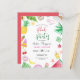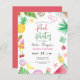 A modern and chic budget pool party summer themed birthday invitation for sweet sixteen featuring fun and colourful watercolor elements such as tropical leaves, coconut, sunglasses, pineapples, popsicles, seashells, camera, flowers, avocado, watermelon, doughnut, cherry and cocktail drink.