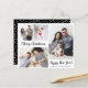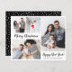 Budget, Minimalist, Elegant Calligraphy Black Script 5 Photo Collage "Merry Christmas" Script Holiday Thin Card in black and white. This festive, simple, whimsical five (5) photo holiday card template (on front 4 photo and back 1 photo) features a pretty grid photo collage and says „Merry Christmas” and „Happy Holidays” which greeting texts is written in a beautiful hand lettered bold brush script font type. On the reverse side one horizontal photo template on snowy background. Pretty greeting card for your family and friends in Christmas Holiday season. Cheap affordable Holiday cards.