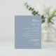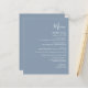 This simple modern wedding menu features white text on a dusty blue background. The word "Menu" appear in stylish handwriting calligraphy. Add the couple's name and wedding date in script and italics, along with menu detail in sans serif font. The reverse side is a matching shade of solid dusty blue.