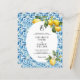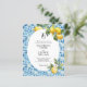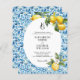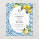 Desigbn features a vibrant, elegant design with blue Mediterranean-style patterns surrounding a central white oval. The monogram at the top adds a personalised touch, while the lemon illustrations provide a fresh, summery feel. The invitation details are presented in a classic, sophisticated font, inviting guests to a wedding at a picturesque location. The overall aesthetic combines traditional and bright elements, making it both timeless and lively.
