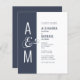 Budget wedding invitation. Modern simple geometric wedding design. Dark blue-ish grey and white. Bold and elegant typography. Bride’s and Groom’s monograms and a big ampersand as a symbol of unity.