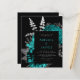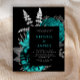 This elegant, moody wedding invitation features a lush, romantic floral bouquet in teal blue with silver faux foil and glitter foliage on a black background. Customise the teal and silver grey text in stylish fonts on a dark rectangle. The reverse side is solid black.