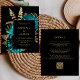 This elegant, moody wedding invitation features a lush, romantic floral bouquet in turquoise with gold faux foil and glitter foliage on a black background. Customise the gold-coloured text in stylish fonts on a dark rectangle. The reverse side provides space for wedding details on a solid black background, along with a QR code guests can scan to visit your website and RSVP, which saves the cost of printing and mailing separate RSVP cards.