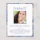 A budget-friendly, modern graduation announcement printed on 4.5x5.6-inch lightweight paper instead of cardstock featuring a multi-colour brush stroke GRADUATE title on the front and 4 photos (a photo collage of 3 pictures on the front and 1 on the back). The back offers an optional text field to personal with your custom information about your graduate. Ideal for conservative budgets and/or hand delivering. ASSISTANCE: For help with design modification/personalisation, colour change, transferring the design to another product or if you would like coordinating items, contact the designer BEFORE ORDERING via Zazzle Chat or makeitaboutyoustore@gmail.com.