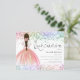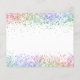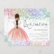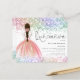 Multicolor Glitter Gown Quinceanera Invitation. A budget price SMALLER 4.5” x 5.6” alternative. Available in a SEMI GLOSS 110 lb CARD STOCK which is the default option (thicker for invitations), OR a SATIN FINISH 80 lb THINNER PAPER STOCK (ideal for enclosures). Envelopes are an optional extra and are slightly larger than the card size. Sparkly elegance for your Quinceanera with an illustration of the back view of a girl with plaited hair in a beautiful pink ball gown and rainbow coloured glitter bordering the top and bottom on each side. The main header is in a set handwriting style script and easily personalise the rest of the text to your details.