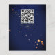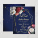 Burgundy roses greenery navy blue background gold geometrical frame floral budget wedding invitation template with QR RSVP code at the back.