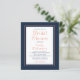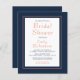 This simple, classic, minimalist design features the words "Bridal Shower" and the bride's name in modern coral display font, with the remaining text in navy blue or coral on a white rectangle framed by a thin coral line. The border/background and reverse are solid navy blue.