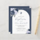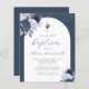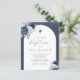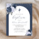 This elegant baptism invitation features a white arch shape on a navy blue background, flanked in two corners by a pair of dusty blue and navy blue floral bouquets with silver foliage. A third, smaller bouquet appears on a silver faux foil cross, above the words "please join us for the baptism of our son" in elegant navy blue handwriting calligraphy and charcoal grey italics. Personalise it with the name in blue script and the details in grey sans serif font. A sprinkling of silver faux foil confetti decorates the top edge of the card. The reverse side is solid navy blue.