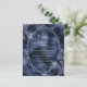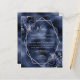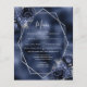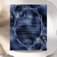 This elegant modern wedding menu features a silver geometric frame decorated with navy blue and silver floral bouquets on a navy blue faux foil background. The customisable text combines silver grey whimsical handwriting, copperplate and italic fonts.