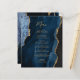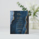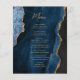 This elegant modern wedding menu features a navy blue watercolor agate border trimmed with faux gold glitter. The customisable text combines gold-coloured handwriting script and copperplate fonts. The reverse side features a matching navy blue and gold agate design.