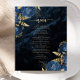 This elegant wedding menu features navy blue floral bouquets set off with gold faux foil greenery in two corners, on a background image of navy blue watercolor agate. The customisable text combines gold-coloured serif and handwriting fonts. The reverse side features a matching navy blue and gold floral and agate design.