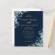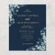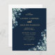 Modern wedding invitation. Featuring flourishes of rustic foliage and tiny blue flowers on a navy blue background with faux gold lettering. Easy to customise with your unique information.