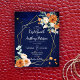 Orange and white roses sage eucalyptus greenery navy blue background gold geometrical frame floral budget wedding invitation template with QR RSVP code at the back.