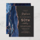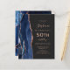 The left-hand edge of this elegant modern 50th birthday party invitation features a navy blue watercolor agate border trimmed with rose gold faux glitter. The customisable text combines rose-coloured handwriting, copperplate and italic fonts on a slate black background. The reverse side features a matching navy blue and rose gold agate design.