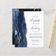 The left-hand edge of this elegant modern wedding invitation features a navy blue watercolor agate border trimmed with faux rose gold glitter. The customisable text combines handwriting, copperplate and italic fonts in charcoal grey on a white background. The reverse side features a matching navy blue and rose gold agate design.