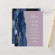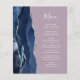 The left-hand edge of this elegant modern wedding menu features a navy blue watercolor agate border trimmed with faux silver glitter. The customisable text combines white handwriting script and copperplate fonts on a mauve purple background. The reverse side features a matching navy blue and silver agate design.