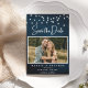 Budget Navy Blue Wood Lights Photo Save the Date - A dramatic, navy blue rustic wood background with photo and glowing string lights hanging overhead. The back of the announcement, includes a QR code. If you prefer not to have the QR code you can simply delete that layer. Part of a collection.