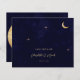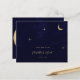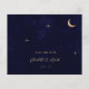 A minimalist modern celestial wedding invitation features a simple and elegant design. It includes a gold foil moon and stars that gently sparkle, set against a midnight blue background. The invitation uses classic serif typography, which adds a traditional and formal touch with its neat and clear style.