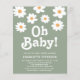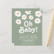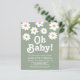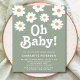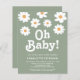 This budget daisy baby shower invitation is decorated with daisies and stylish retro typography on a sage green background.