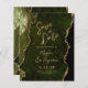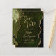 This elegant wedding save the date card features a background image of olive green watercolor agate trimmed with faux gold glitter. The customisable text combines gold-coloured modern handwriting, copperplate and italic fonts. The reverse side features a coordinating olive green and gold agate design.